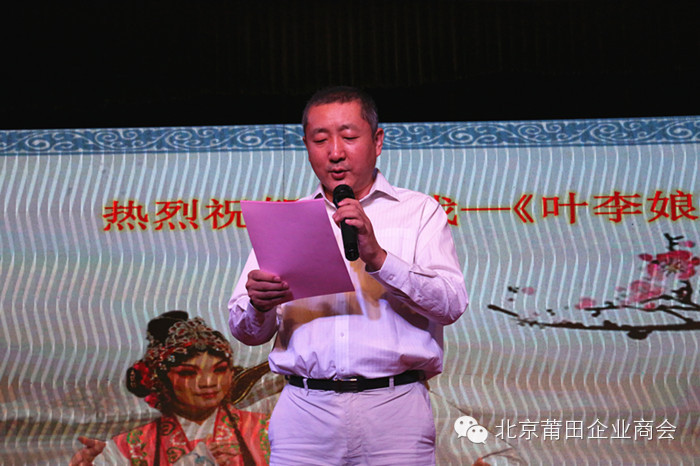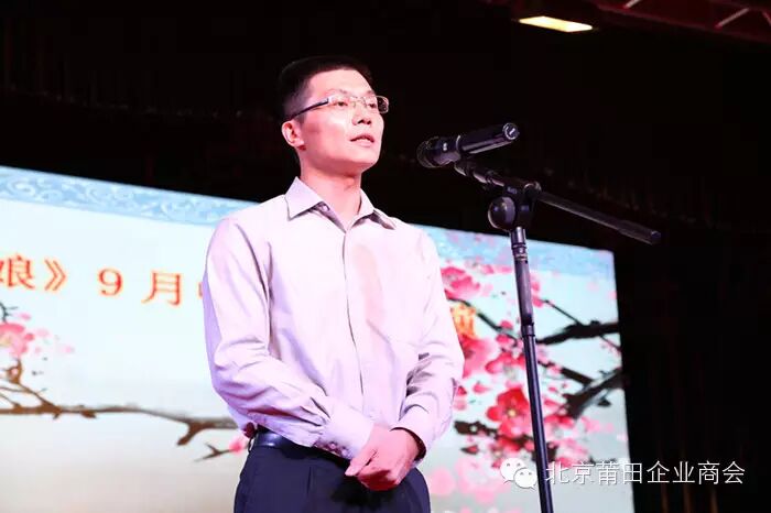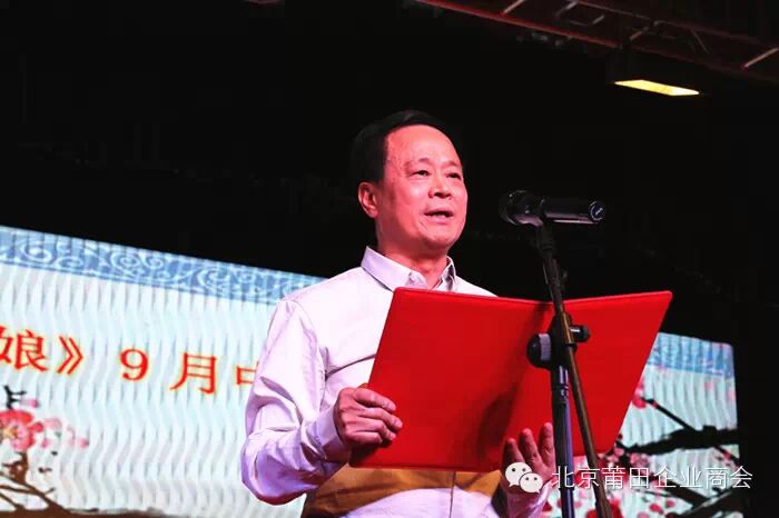 随后,市委常委、宣传部长程强发表重要讲话。他首先代表莆田市委、市政府向赞助、协办本次莆仙戏巡演的莆籍企业家们和北京莆田企业商会表达了诚挚的谢意。他说,在京创业的莆籍企业家,他们在助力北京发展的同时,始终十分关心家乡各项建设,通过各种形式支持家乡经济社会文化发展,他代表市委、市政府向在京莆田籍企业家对家乡作出的特别贡献表示衷心的感谢。他指出,莆田历史厚重,文化底蕴深厚,更有“妈祖故里”的美誉,厚重的历史文化背景孕育了一代代优秀的莆田人。莆田戏作为莆田地方文化的优秀代表,不仅是地方剧种保留最完整的剧种,深厚的历史厚重感更是为莆田的文化传承,文化产业的发展起到了引领作用。作为文化瑰宝,莆田市一直注重扶持莆仙戏的发展和传播,力争让广大戏曲观众观赏到艺术效果最佳的戏目。把北京作为全国巡演的首站,正是希望通过演出让在京的乡亲能够听听家乡戏,领略家乡戏曲的风采。
